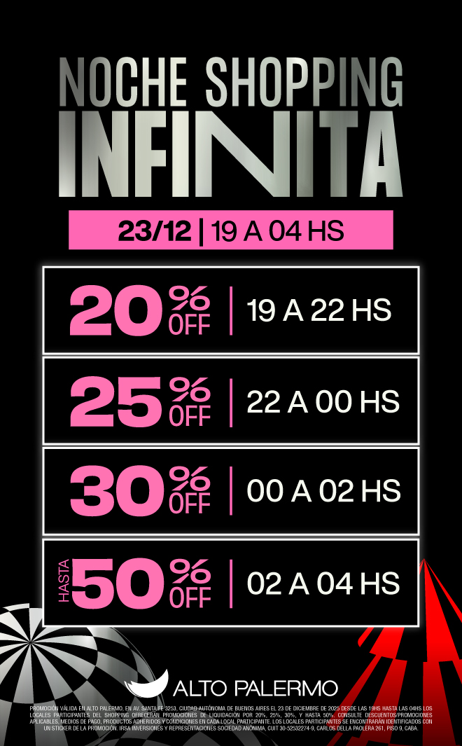 PROMOCIÓN VÁLIDA EN ALTO PALERMO, EN AV. SANTA FE 3253, CIUDAD AUTÓNOMA DE BUENOS AIRES EL 23 DE DICIEMBRE DE 2025 DESDE LAS 19HS HASTA LAS 04HS LOS LOCALES PARTICIPANTES DEL SHOPPING OFRECERÁN PROMOCIONES DE LIQUIDACIÓN POR 20%, 25%, 30%, Y HASTA 50%. CONSULTE DESCUENTOS/PROMOCIONES APLICABLES, MEDIOS DE PAGO, PRODUCTOS ADHERIDOS Y CONDICIONES EN CADA LOCAL PARTICIPANTE. LOS LOCALES PARTICIPANTES SE ENCONTRARÁN IDENTIFICADOS CON UN STICKER DE LA PROMOCIÓN. IRSA INVERSIONES Y REPRESENTACIONES SOCIEDAD ANÓNIMA, CUIT 30-52532274-9, CARLOS DELLA PAOLERA 261, PISO 9, CABA.